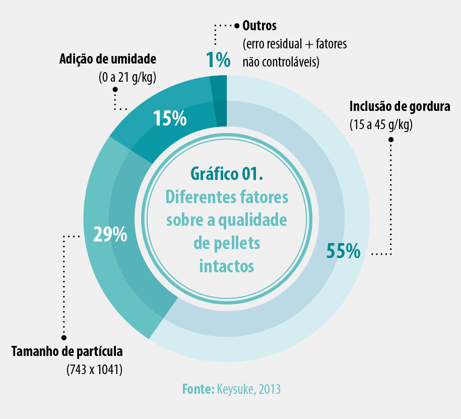 Alguns fatores podem influenciar na qualidade física da ração peletizada como a formulação, a granulometria das matérias-primas, o condicionamento, o resfriamento e a taxa de compactação das matrizes.