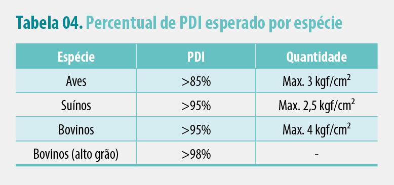 Uma das formas para medir a qualidade física da ração é pelo PDI, que pode variar de acordo com os demais itens já apresentados acima (a formulação, a granulometria, o condicionamento, o resfriamento e a taxa de compactação das matrizes, gordura, umidade) e variar de acordo com a espécie animal. Alguns padrões precisam ser respeitados para que o desempenho dos animais ocorra conforme o desejado quando se fala em qualidade física da ração.