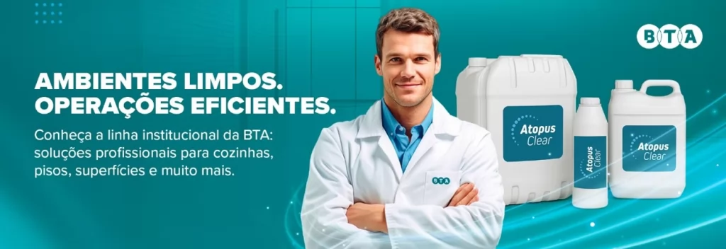 A higienização institucional completa exige atenção a cada detalhe e os pisos são protagonistas silenciosos dessa estratégia. Com a Linha Clear da BTA você garante eficiência operacional, durabilidade dos materiais e segurança para todos. Conheça os produtos da Linha Clear e transforme a rotina da sua equipe!